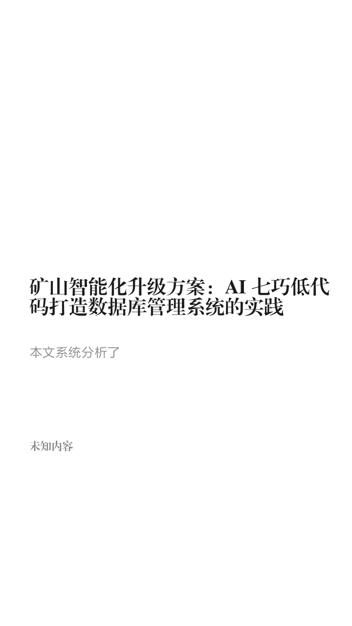 矿山智能化转型是提升行业安全性、生产效率和可持续性的必由之路,而现代化的数据库管理系统是这一转型的基础支撑。通过引入"AI+七巧低代码"技术组合,矿山企业能够以较低成本和较快速度构建智能数据平台,解决传统系统数据孤岛、响应迟缓、智能不足等痛点。