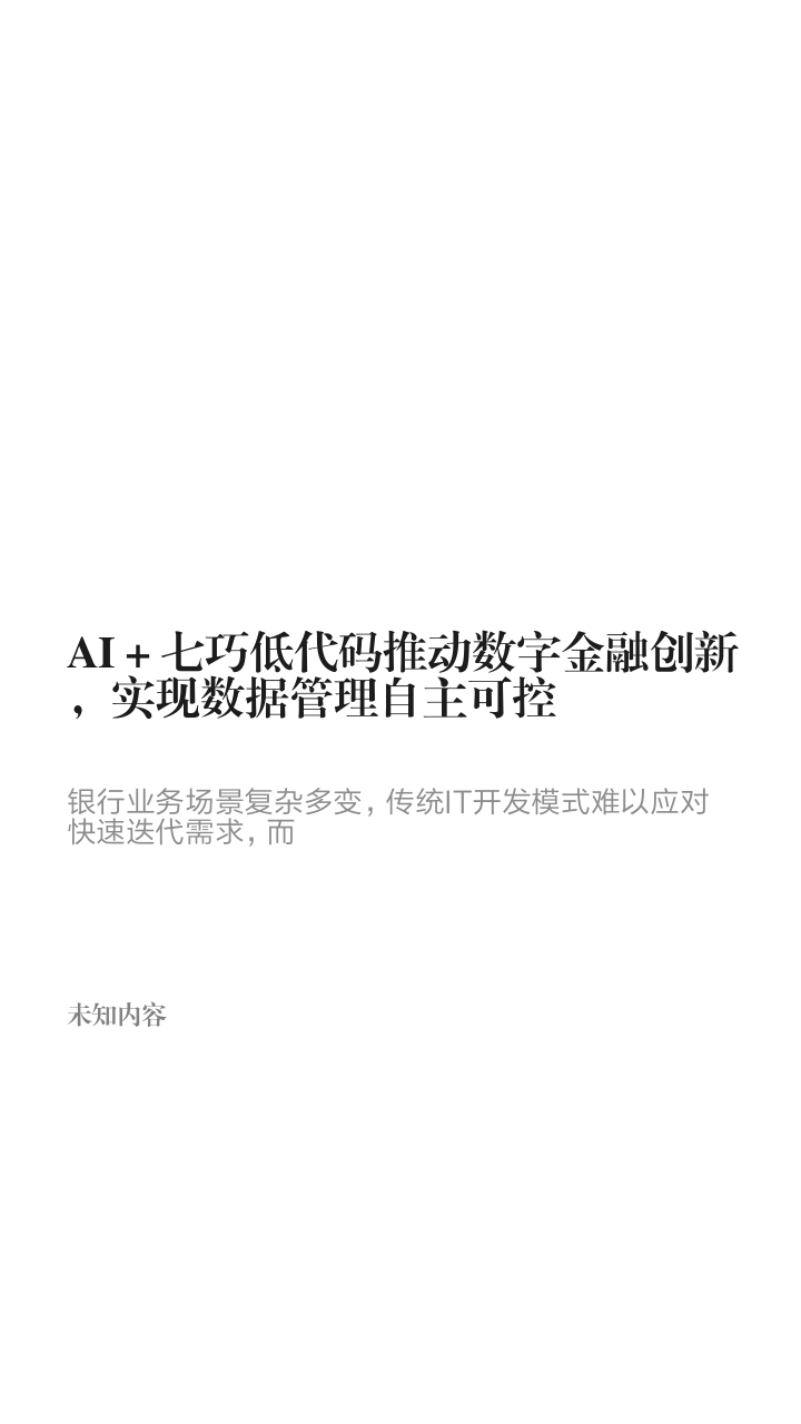 数据库管理系统改造在银行业的智能化升级路径中具有重要现实意义。一方面,金融信创政策要求核心系统实现自主可控;另一方面,数字金融创新又对系统性能、弹性扩展和智能化水平提出了更高要求。"AI+七巧低代码"作为一种融合创新的技术范式,有望成为平衡安全与创新、效率及成本的重要突破口,帮助银行业在数据库升级浪潮中构建面向未来的数字基础设施。