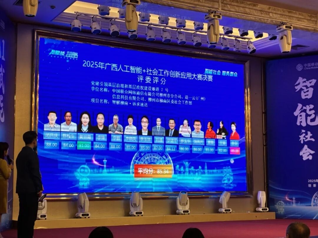 11月20日,由广西壮族自治区党委社会工作部、中共贵港市委员会、自治区数据局联合主办的2025年AI+社会工作创新应用大赛决赛在贵港圆满落幕。中国联合网络通信有限公司柳州市分公司、柳州市柳南区委社会工作部携手道一云,凭借“智解柳南·诉求速达”项目,在“党建引领基层治理和基层政权建设”赛道斩获二等奖,以技术创新为基层治理数字化升级交出亮眼答卷。