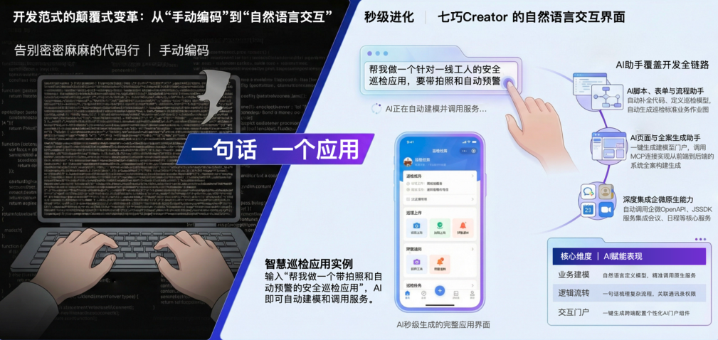 - 道一云七巧 AI 原生低代码 = AI 先画好全套施工图 + 搭好主体框架:AI 自动标注墙体、门窗布局并适配建筑规范,用户只需在可视化界面精修细节。