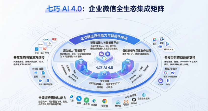 - 跨系统集成:AI 辅助实现与原有 ERP、HR 系统的互联互通,打破系统间的数据孤岛。同时系统可无缝搭载于企业微信基座,与企业日常办公深度融合,员工上手零门槛。
