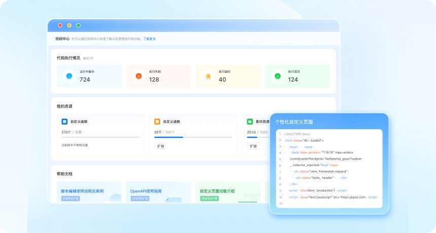 后端提供java脚本,自定义函数、java微服务脚手架开发等;前端支持在线IDE、JS/CSS、Vue脚手架开发等。