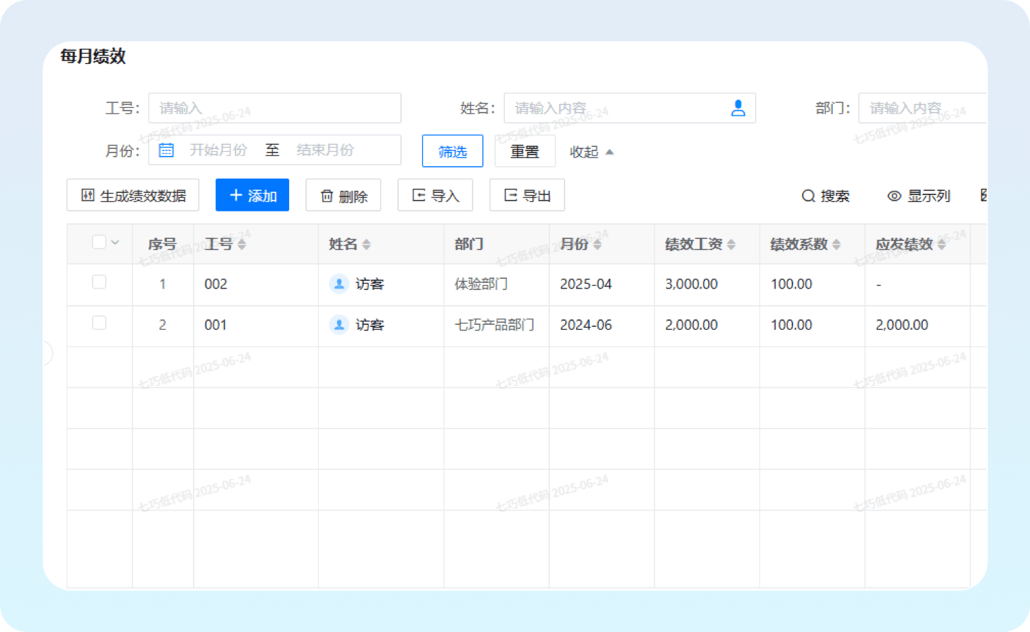 通过七巧低代码整合多个模块数据,实现了职能端数据自动化录入管理,为流程处理的提效精准赋能。