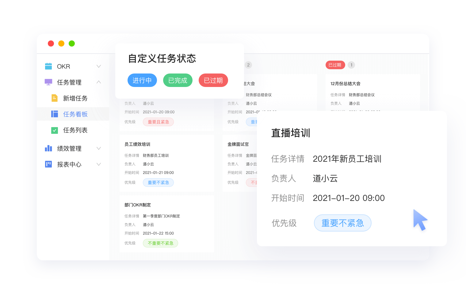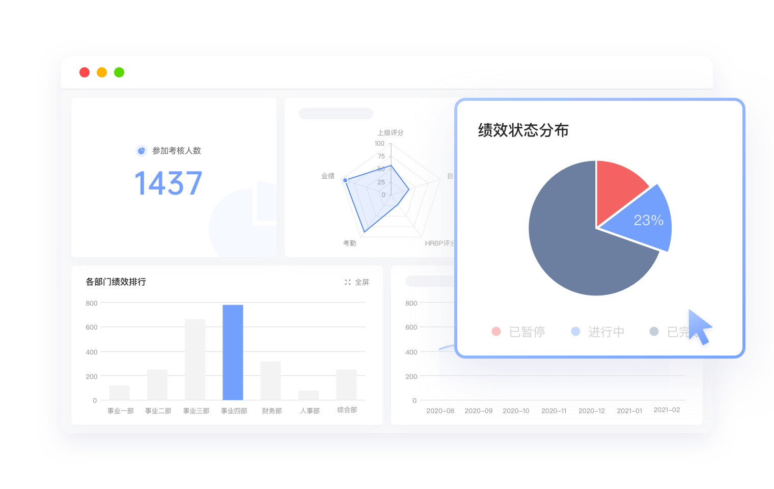提供OKR、任务、绩效三大报表中心,多维度数据看板,保证考核的全面性和透明性,数据实时更新,无需手动统计
